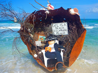 We had first seen the still upright-structure in September 2010, when we visited the sculpture garden located at the southern tip of Isla Mujeres Mexico.Reading the plaques at the base of each statue we had noted the artists were from various European countries as well as Mexico. In 2010 many of the statues had weathered the abuse of salt, water, and wind but two or three had already collapsed.