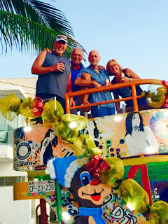 Lawrie, Lynda and SparkyTwo hours later our tired raggedy group disbanded in centro on Rueda Medina. Elmo’s vehicle happened to park near the assembly point for the Municipal Presidente of Isla’s Christmas cavalcade. The Presidente suggested to Freddy that Elmo should join that parade. Freddy who had just spent two hours dancing in the back of a pickup truck wearing a full-body fur-suit was soaked through to his underwear with perspiration.
