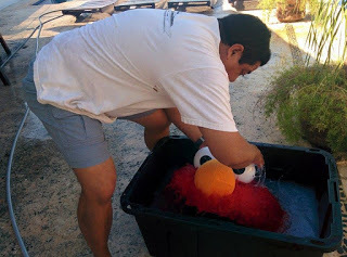 Elmo getting his annual - post parade bathAs for the Elmo costume of the 2011 Halloween party, it now resides at Freddy’s house. It’s a very good home for Elmo. Thank you for being the good-hearted, crazy person who thought up this event.