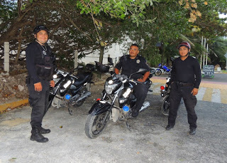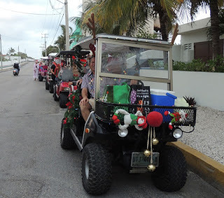 Lawrie & Lynda Lock, con Sparky2013 también fue el año que aprendimos a quedarnos en los carritos de golf y no bajarnos con los disfraces puestos. Lawrie había entrado en un grupo de personas para saludar a los niños, cuando un grupo de adolescentes borrachos pensaron que sería cómico para agarrarlo, tirarlo y atraparlo-varias veces. Imagínense un hombre usando un disfraz de todo el cuerpo con una cabeza muy grande tirándose para arriba y abajo en un grupo de personas. Solo en México!Dos horas mas tarde nuestro grupo cansado se dispersaron en el centro por Rueda Medina. Por casualidad, el vehículo de Elmo se estacionó cerca del punto de inicio de la caravana navideña del Presidente Municipal de Isla Mujeres.