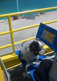 I usually get to come along to woofgoodbye, or greet them when they return. My buddies Skipper the dog and Jax the cat met us at the boat with their humans. All of us four-legged folks were given the nice upstairs view seats, while some of our humans had to sit inside on lower deck.