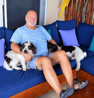 Lawrie and the boys! Sparky and MaxBut in January of this year my sweetie, Lawrie, was diagnosed with a debilitating disease – PSP, Progressive Supranuclear Palsy. The left side of his body doesn’t get the messages from his brain as quickly as the right side does. PSP creates serious stability and mobility issues for him.Max likes to run and greet Lawrie with his paws on his knees, or to spin in happy circles. It’s just too risky for Lawrie having so much activity while he is trying to move around in the house. From existing on the street for five years to living inside a house Max has progressed well in nine months that he has been with us. The funny thing about street dogs is that besides not knowing how to behave inside a house they don’t know how to play. We have taught Maxie to play fetch with a tennis ball, and he enjoys it. He swims in the oceans, runs up and down the beach and fetches anything he can including discarded plastic bottles and other bits of ocean junk.