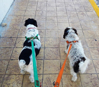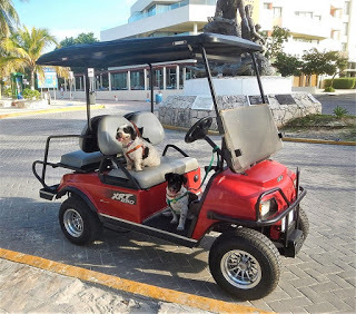 Sparky and Max in our carito de golfMaxie is still a little timid with new people until he gets to know them better. Having said that, we have recently had eight men working in our casa on Isla Mujeres for two week, creating a main floor bedroom and bathroom for us to accommodate Lawrie’s reduced mobility. Max has been totally calm and accepting of the guys coming and going all during the day.The first time I tried to put a harness on Max he was very nervous, but now he knows that it means he is going out for a walk or a ride and he is happy to cooperate. He walks very well with a leash and harness, better than Sparky who likes to pull me where he thinks we should go. The biggest difference that we notice between the two male dogs is Sparky will add his ‘mark’ at least thirty or forty times on a pee-walk, while Max usually has a huge pee and just gets it done! The look of pure relief on his face is comical.