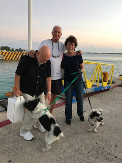Max waiting for boat ride to CancunHaving two energetic dogs underfoot is too risky for Lawrie, and as much as we loved the fuzzy little guy Max had to find a new home. Fortunately for us our friend Janet Cummins sent our blog post to her friend Dianne in Arizona. Dianne Stocks who has had other rescue dogs, including her current beautiful girl Willow, agreed to adopt Max.Wednesday was a tough day for Max and I. He left his island in paradise for the first time ever. Even though I have been giving him an anti-anxiety medication for a few days in preparation for the trip, riding on the Ultramar passenger ferry frightened him. But, by the time we got him loaded into the CARM van and headed to the airport he had stopped trembling and seemed interested in his new adventure. A special thanks to Denise and Mike Burton who helped me get from the boat to the CARM van on the Puerto Juarez side of the trip. Mike, you looked so handsome carrying my purse!