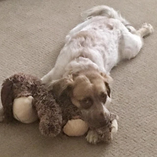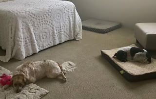 Sparky and Max not sure about the renovations to their houseHe enjoys his big comfy bed and his toys, which would go with him. He still carries his very first toy that Sylvie gave him a year ago. The blue and grey elephant is dog-eared and dirty, repeated washings are unable to remove his loving slobber. It’s his favourite. I have to check his mouth before we go out for a walk otherwise the elephant might be dropped and forgotten when an interesting bird or crab claims his attention.