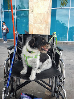 Max - keeping an eye on our wheelchairAt the airport the porters and wheelchair assistants were a huge help to us, bustling us to the head of the immigration line, the check-in line, then outside for a doggy pee break before he had to be surrendered to the baggage handlers. I had to use the wheelchair service because of course two days before I was due to make the trip my sciatica decided to act up, making walking or standing extremely painful. (Perfect timing!)The American Airlines folks were delightfully kind and accommodating with Max and me. By the time we reached Phoenix he had adjusted to his international traveler status, and was doing just fine when I reclaimed him. My assistance wheeled us both out to meet Dianne and her friends, Laurie and Chris, who had come to pick him up. It was a very emotional meeting for me because I knew my time with Maxie was coming to an end, and Dianne because she was just beginning a new adventure with him. After tearful hugs and goodbyes I slipped away leaving Dianne to get to know her new guy better.
