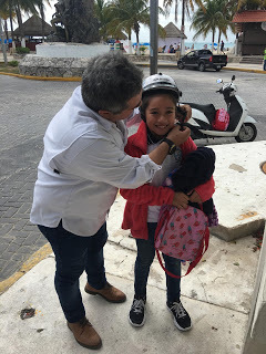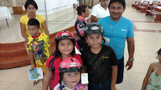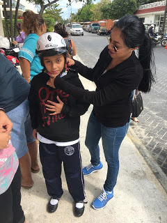 They started small asking people to purchase helmets at a local hardware store and leave them with at the front desk of Marina Paraiso Hotel. Managers, Brad and Tiff Waring, had generously volunteered to be the collection point for the helmets. The initial distribution was handled through the schools, with teachers helping to identify the students who urgently needed the safety gear.The second phase of Helmets for Isla was to collect donations and order in bulk from a Mexican company. Their first order was for 50, then the second was 420 and recently another 400 were ordered. In total there has been close to 1350 helmets distributed through the schools, through Volunquest, and through the churches.