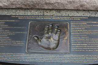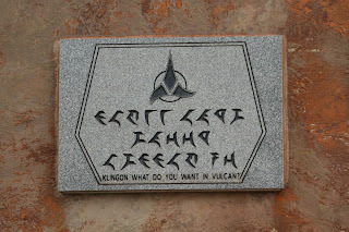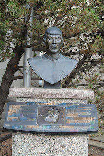 Nearby, a replica of the starship Enterprise from Star Trek V has been mounted on a pedestal which includes writing from Star Trek alien languages such as Klingon. In 2010 Leonard Nimoy visited the town and was honoured at the town centre with a bust and handprint. A transporter, Doctors Mural and other Star Trek attractions can be enjoyed throughout the town. The Vulcan Tourism & Trek Station has hosted an annual Star Trek Convention (held the last weekend in July) "VulCON" since 1993 where celebrity guests are beamed in to spend the weekend with attendees. It is a unique convention in that celebrity guests & Trekkies get to know each other during the Meet & Greet, Q&As and a banquet and dance. This convention attracts hundreds of Star Trek fans from around the world.