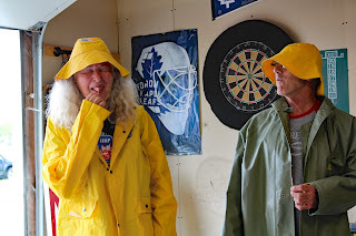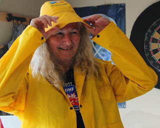 Next Danny handed them the traditional sou’wester rain gear. Once theywere properly dressed, he then asked, “Is ye a Screecher?”