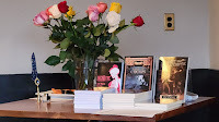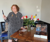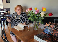 My publisher Danielle Ackley-McPhail came to help with the launching, and I don't know what I'd have done without her. Besides handling sales and reining me in when I needed to sign books, she brought a beautiful bouquet of roses and her camera, which I had utterly forgotten.