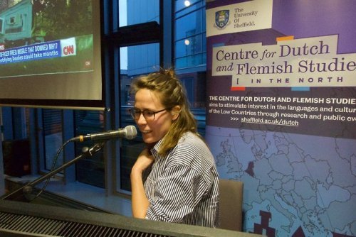 Afgelopen twee weken was ik writer in residence in het Verenigd Koninkrijk. Studenten Nederlands van de University of Nottingham, University of Sheffield en University College London vertaalden twee teksten van mij naar het Engels. Een van de vertalingen is die van de voice-over voor de virtual reality installatie ROZSYPNE en is binnenkort dus al te horen. Op de foto hierboven geef ik een presentatie over de laatste vijf jaar werk en onderzoek, die hebben geleid tot het werk wargifs, de novelle De Benen van Petrovski, het documentair fotoproject OSELYATA, de VR installatie ROZSYPNE en (ik hoop over anderhalf jaar) mijn debuutroman. Het was een waar feest en een eer om uitgebreid met enthousiaste studenten en taalliefhebbers te kunnen werken.
