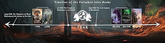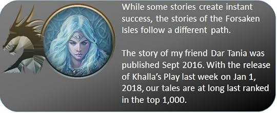 Another aspect to the Forsaken Isles is that the stories occur in a very long timeline set against immortal dragon rulers and a divine prophesy of the Spear and Shield. These are the only constants. A character in one book is probably going to be a legend in some other book. For example, in Dar Tania 1 and Dar Tania 2, the Sage Alaura is shown as a winged statue on the cover of Khalla’s Play, set 1800 years later. I realize this might annoy those with a meticulous nature and I make no apologies. But, I offer you this. In the worlds of immortals, 1800 years is a normal lifetime. It might be only 2 generations of elves, 7 generations of dwarfs, and 1 generation of dragons.