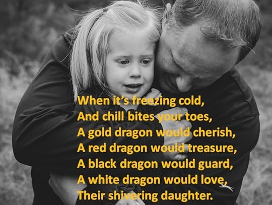 Virginia was cold end of 2017. We had family visit and did pictures. My three-year-old was freezing and so I held her. A blue dragon wouldn’t hug a child. They’d do something magical so the child would feel warm. A silver dragon would have rescheduled the pictures to summer. I am my daughter’s dragon.