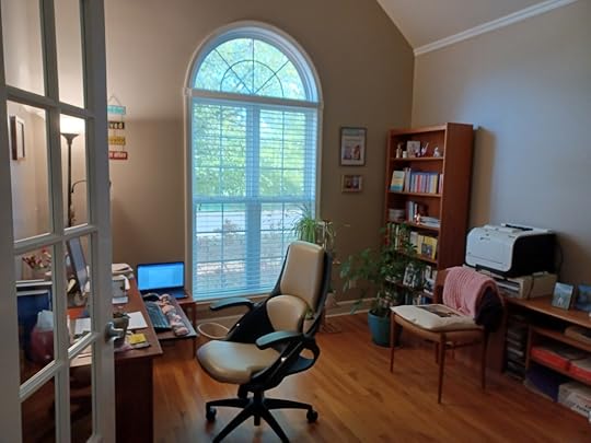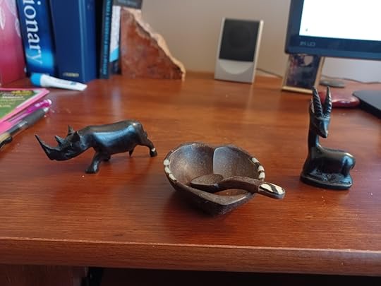 As I started to pull the room together, I focused first on practical things like the desk, computer, printer etc but then began to fill it with objects that bring back special memories to me, others that are an inspiration to my writing and some that simply make it a more attractive space to spend a lot of time in. So, on my desk you’ll find these beautiful wood carvings brought back from Kenya by my son who was a missionary there for a while.