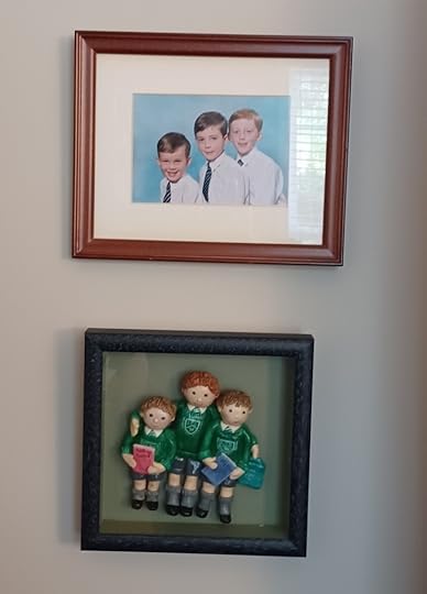 On the walls I’ve got family pictures, along with one of my first ever book signing all the way back in 2006 and some Cornish prints. Two of my favourites are these of my three sons in their school uniform from when we lived in London for three years back in the 1990s – one is an official school picture but the other was amazingly created out of clay and then painted by a friend at the school and given to us when we left.