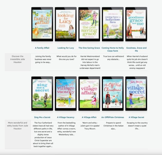 Julie Houston’s first three novels GOODNESS, GRACE AND ME, THE ONE SAVING GRACE and LOOKING FOR LUCY were all Amazon Humour #1 best sellers both here in the UK and Australia. LOOKING FOR LUCY hit the #1 best seller overall in Australia. A VILLAGE AFFAIR was the seventh most downloaded book of 2019 and has sold over 300 000 copies in ebook and paperback. She is published by Aria/Head of Zeus and her eleventh novel THE VILLAGE VICAR published in January 2023. The follow up to The Village Vicar – The Girls of Heatherly Hall is out July 2023. Her seventh novel, SING ME A SECRET won the Sapere Books Popular Romantic Fiction Award in 2021.
