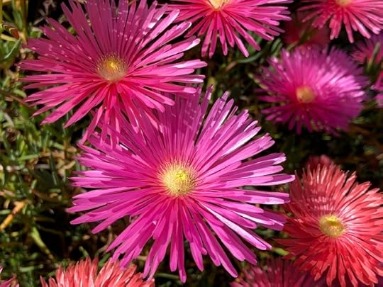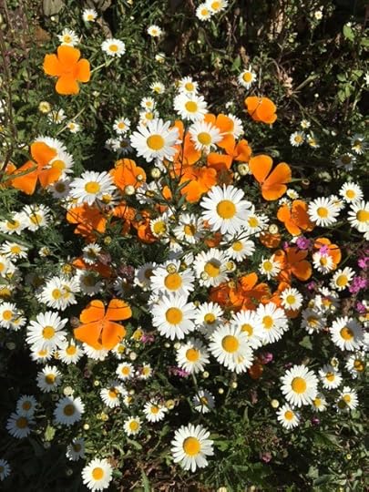 Californian PoppiesFilling the borders agapanthus and lampranthus always make me think of Cornwall. Liz Fenwick (a fellow Cornish author) grows spectacular ‘aggies’ in her garden, but this photo was taken at Trebah. It’s one of my favourite places, a beautiful valley just filled with plants, made all the more poignant by the fact troops left for D-Day from the tiny cove at its seaward end. We see lampranthus taking advantage of any sunny wall and this particular one is outside Truro School. The californian poppies and daisies have been borrowed from the Eden Project.