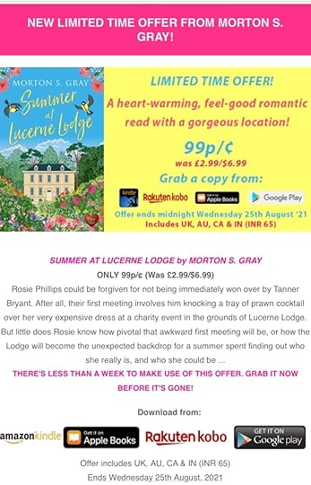 My latest novel Summer at Lucerne Lodge is currently only 99p, so if you haven’t read it then grab a bargain before the end of September. Buying links – Amazon Check on my Choc Lit author page for other purchasing options here