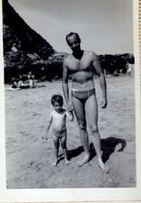 Dad with my little BroThe musty scent of stored canvas is enough to bring those childhood memories flooding back. We learned to surf in Porthtowan, on curved wooden belly boards, we were burned scarlet every year and our skin hung in tatters like a badge of honour. The only suntan lotion was factor 0 Ambre Solaire oil, another scent from my childhood.