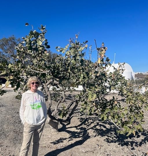 Eva in the pistachio orchard at Nomikos EstateBeing volcanic, Santorini has rich agricultural land, but sadly it’s being constantly eroded by tourist development, a trend Yiannis Nomikos is keen to reverse, and a theme I carried into the book. Tourism may earn the big bucks, but the traditional way of life is important too; who wants to visit an island that has basically become a theme park?
