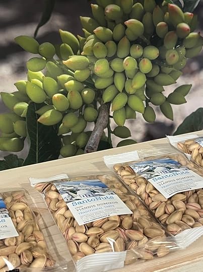 The crop which takes centre stage in The Santorini Writing Retreat are pistachios, largely because they are harvested in late summer when the book is set. We wandered the pistachio orchards with Yiannis, learning about how they are grown, harvested, and dried in the sun. And how the trees had been planted by his father from seed in the year he was born. His connection to them was palpable and showed us, more than anything, what traditional farming on the island is all about.
