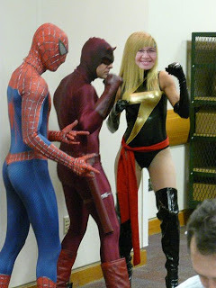 Masks? Frogman? After Angela's stint on Dancing With The Stars, raising Elvis from the dead, terrorizing the Canadian countryside as a zombie, and raising her Alien legion of Bugites, I really, REALLY didn't think things could get any weirder. But it really does appear that Angela...just might be...Ms. Marvel.