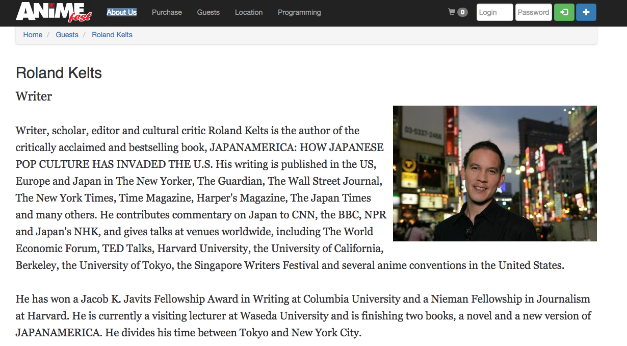 Roland KeltsWriter, scholar, editor and cultural critic Roland Kelts is the author of the critically acclaimed and bestselling book, JAPANAMERICA: HOW JAPANESE POP CULTURE HAS INVADED THE U.S. His writing is published in the US, Europe, and Japan in The New Yorker, The Guardian,