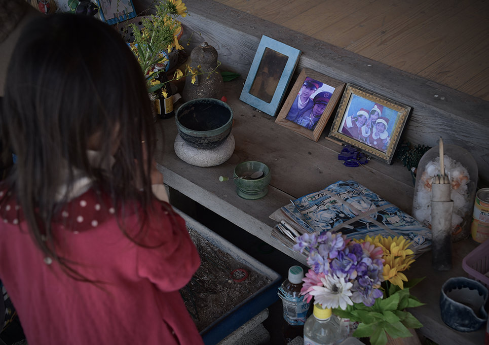 The butsudan (family altar) in his house bears four football-sized ceramic urns, one for his mother, father, daughter, and son, arranged in a horizontal line behind portraits of each. Two of the urns are filled with cremated ashes from a kotsuage Buddhist ritual, in which the larger bones are separated from the ash by surviving family, like the one I experienced at my grandmother’s funeral, held at a nearby temple exactly one year after the tsunami. The other two remain empty.