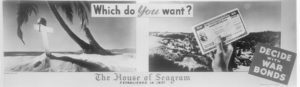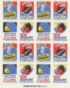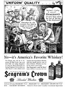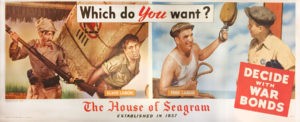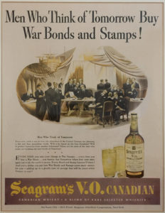 Welcome to the second installment of Seagram vintage posters, ads, and products. Like most companies at the time, Seagram participated in using its advertising and promotion efforts and money on behalf of the war effort. This included ads promoting the purchase of War Bonds and public service announcements.