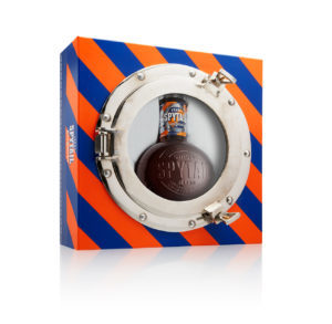The SPYTAIL bottle shape is based on a Bathysphere (a primitive form of submarine) with a porthole embossed on the front and back. Hidden within the embossing are the co-ordinates of the final resting place of Jules Verne. The navy blue and orange striped label, based on a French Navy signal flag, is adorned with engineering details from original submarine designs. The heavy stopper is crafted from metal and embossed with the words “Voyages Extraordinaires” – a nod to underwater pioneers.