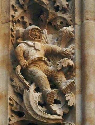 Unfortunately for Chariot buffs, however, the origins of the carving are neither ancient nor mysterious. The astronaut figure dates not from the 12th century or the 16th century or even the 18th century, but from 1992, and we know both who put it there and why: The New Cathedral was undergoing restoration work during that period, and one of the artisans engaged in the project chose to engage in a bit of tradition by "signing" his work with a contemporary symbol representative of the 20th century: an astronaut." [snopes.com]