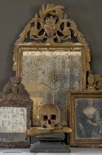 And if your tastes lean more toward the distressed and antiqued, it is easy to create a compelling vignette like this once--if you don't mind getting your hands dirty digging up some of the pieces. :D The old-world reliquary feel of this grouping would look fantastic against a slate gray wall (as shown here) or against a tone-on-tone metallic damask.