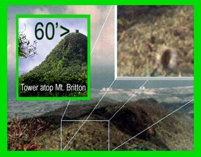 The image above of the "creature" standing higher than the surrounding vegetation in the El Yunque National Rainforest is at odds with the dimensions described by witnesses. For this image to be true, this creature would have to stand between 40 and 60 feet tall, as can be seen when we use the tower image [left inset above] for scale reference. This tower stands approximately 60 feet high. So, it gives us a good scale for the average height of the surrounding (and quite ubiquitous) vegetation. The same trees you see by the tower, are the same you'll see on the mountain in the Comecogollos image. In fact, I dare say the Comecogollos image was probably shot from the vantage point of this tower since landmarks visible from it are clearly in frame here as well.