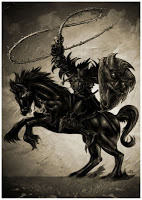 The Dullahan or "dark man" is a harbinger of death in a sort of Irish headless horseman tale. The headless Dullahan rides a black horse with fiery eyes while clutching his head beneath his arm. Wherever the rider stops, death visits hapless mortals. However, you can bribe the Dullahan with gold and he may spare your life. I wonder if he ever thought about running for office...