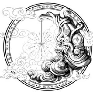 The North Wind is normally depicted as a blue face in a complex burst of spiraling tendrils, and is equally often named “he” and “it.” He is the Principality of free movement and free choice, trade, sailing, the cold, weather, storms, clouds, silver, amber, and leaving your childhood either physically or metaphorically. The North Wind is sometimes called the Blue Man, Father Sky, the Lord of Whispers, and the King of Feather and Flower.