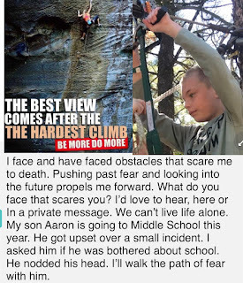 I face and have faced obstacles that scare me to death. Pushing past fear and looking into the future propels me forward. What do you face that scares you? I’d love to hear, here or In a private message. We can’t live life alone. My son Aaron is going to Middle School this year. He got upset over a small incident. I asked him if he was bothered about school. He nodded his head. I’ll walk the path of fear with him.