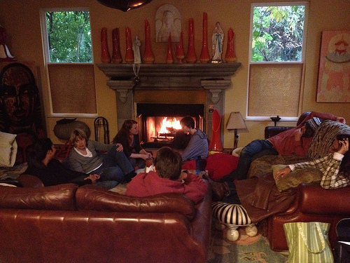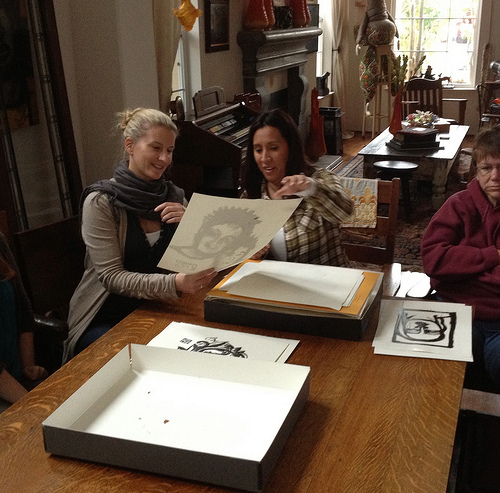 We spent a lot of time just chatting in front of the fireplace. We each gave a brief demo of how we worked, talking about our process. It was funny, really -- each one of us basically felt like our own process was SO boring yet when it came to seeing how the others did their work, we were each fascinated. Lots of kidlit and art talk and picture book writing talk, plus browsing of each other's portfolios.