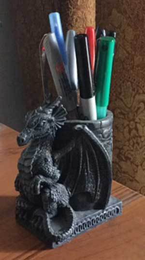 I bought this dragon-guarded pen holder in Britain more than a decade ago, on my first solo trip overseas. It's been a fixture on my desk ever since. It reminds me to keep the magic in my writing and to strike out on new ground. And it conveniently holds the wide variety of pens I like to have on hand: blue ballpoint for mundane tasks, green gel for signing books, red for line edits, and black and silver Sharpies for signing bookplates and bookmarks.