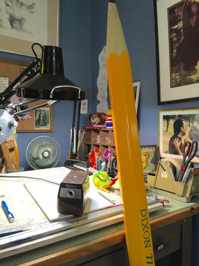I photographed an electric pencil sharpener that my picture book writing teacher extraordinaire, Barbara Bottner gave me when I was working on my very first book which she mentored me through. It mean so much that she believe in me enough to work with me above and beyond, and for her to think enough of my work to give me a pencil sharpener to encourage my drawing. I couldn’t help but add the giant pencil to the photo. It is only fitting. This was a present from my wife and children many years ago. Talk about support and encouragement to dream big! Both of these are important mementos in my studio.