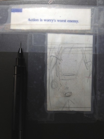 "Taped to my desk: The first tiny sketch I did for TEA REX (and a bit of fortune cookie wisdom that reminds me to keep my nose to the grindstone...)"