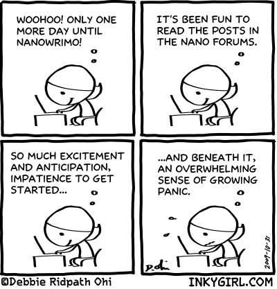 I won't be participating in NaNoWriMo this year, though I'll be cheering on everyone who is. For those of you doing NaNo, do check out my friend Errol Elumir's NaNoToons, being posted daily. I had to opt out of co-authoring NaNoToons this year because of scheduling, but I'm looking forward to seeing what Errol posts. :-)