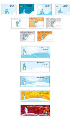Click for bigger version of final art. ©2013 Patricia StormsI had a lot of help from my art director as well as my editor. I was terrified most of the time, but it was a very supportive, nurturing environment. It was particularly scary because I was trying out some new styles. Usually I just hand-draw my art, ink it and then colour it in Photoshop. But this time I wanted to create a more warm and organic look, so I outlined the penguins with charcoal pencil (something I’d NEVER done before!) and I experimented with new brushes in Photoshop, and even added Japanese paper in the background for a wee bit of collage effect.