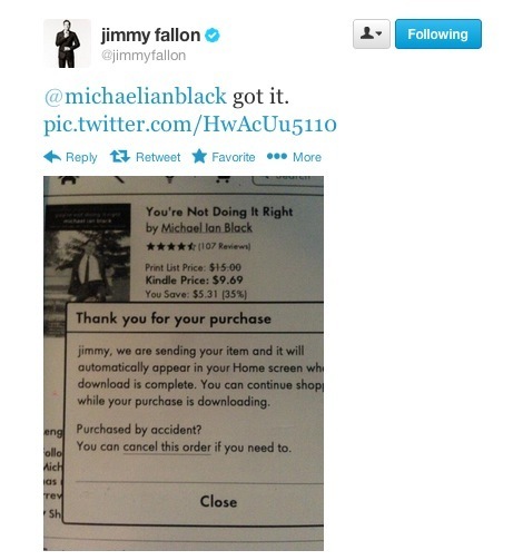 Then Michael Ian Black (author of I'M BORED, the picture book I illustrated last year for Simon & Schuster BFYR) and some of his Twitter followers suggested to Jimmy that he should buy Michael's book, YOU'RE NOT DOING IT RIGHT. If I had been online at that point, I would have been tweeting as well -- I *love* that book.