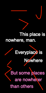The strange and aggressively annoying men in the Pointers room. The fellow who had given him an epic novel consisting of a blank page with only a handwritten inscription. The midget at the urinals, aptly named Shorty, who had brilliantly suggested that Milford think of his mother the awful Mrs. Milford in order to deflate his erection. The endless journey down a dim corridor with the midget piggyback on his shoulders. The emerging into yet another barroom called The Man of Constant Sorrow, filled with people who looked like vegetables, the encounter with that other annoying man called Slacks, and yet another horrible journey down a dim corridor, and then that other bar filled with sad clowns, then still another long walk down dim corridors, and his meeting with his aforementioned dopplegänger, "Stoney"…
