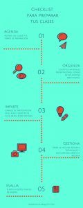 Si tú también das clases o te gustaría darlas, te presto mi checklist, con los once pasos en los que organizo una clase, resumidos en esta infografía. La lista sirve para distintas tipologías de cliente y ordena las tareas de forma cronológica.
