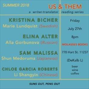 Us & Them: Translators (who are also writers) Kristina Bicher, Elina Alter, Sam Malissa, and Chloe Garcia Roberts present their translations from Swedish, Russian, Japanese, and Chinese, as well as work they wrote in English in forms other than translation. More information here. Molasses Books, 770 Hart St., 8:00 p.m.