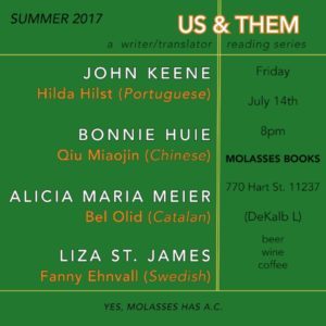 Us&Them: A Writer/Translator Reading Series. The Summer 2017 installment of this reading series featuring writers who are also translators reading both their own and translated work will present John Keene translating Hilda Hilst (Brazil); Bonnie Huie translating Qiu Miaojin (Taiwan); Alicia Maria Meier translating Bel Olid (Catalonia); and Liza St. James translating Fanny Ehnvall (Finland). Molasses Books, 770 Hart St. (Dekalb L), Brooklyn, 8:00 p.m.