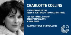 Tonight at the Goethe-Institut New York the 2017 winner of the Helen and Kurt Wolff Prize was announced: the prize goes to Charlotte Collins for her translation of Robert Seethaler’s novel A Whole Life (published in 2016 by Farrar, Straus, and Giroux). So delighted to hear it! The $10,000 award will be presented during a ceremony held in New York in June.