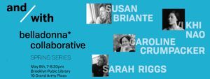 Belladonna* with BPL reading with new chaplets: translator Sarah Riggs joined by Susan Briante, Carolina Crumpacker, and Khi Nao for a night of poetry hosted by Belladonna* Collaborative, more information here. Brooklyn Public Library, 10 Grand Army Plaza, Brooklyn, 7:00 – 8:30 p.m.