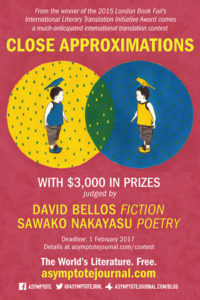 It’s another year, and the deadline for this year’s Close Approximations Translation Prize is coming right up. This is the third year Asymptote Journal is running the prize, and the judges this year will be the illustrious David Bellos (fiction) and Sawako Nakayusu (poetry), winner of the 2016 PEN Poetry in Translation Prize and the 2016 Lucien Stryk Prize for her translation of The Collected Poems of Sagawa Chika. The prize comes with a $1000 purse for each winner ($250 for runners-up). You’ll find more information about the prize and complete submission guidelines on the Asymptote website. The deadline for submissions is Feb. 1, 2017.